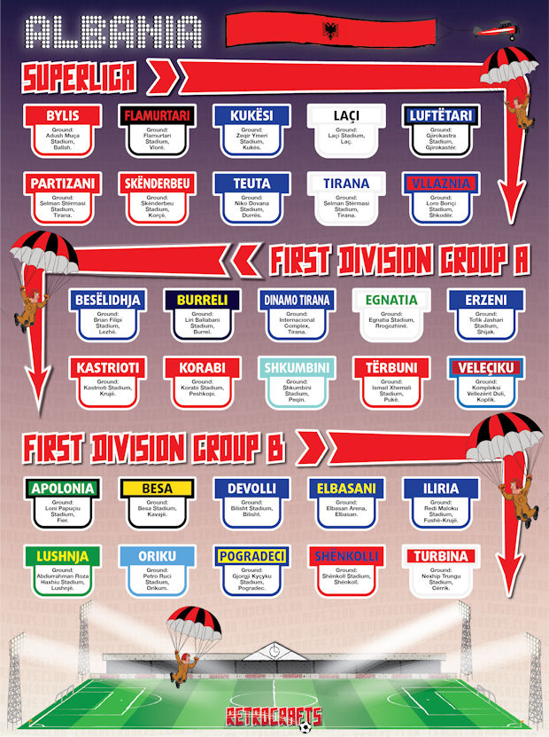 The League Ladders for the top two tiers of football in Albania. You can check them out here - Retrocrafts.